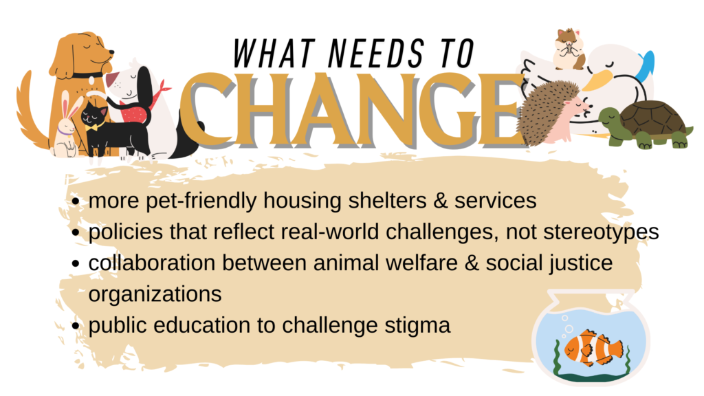 Many bylaws and housing policies unintentionally punish pet owners living in poverty. These rules often reflect assumptions about what “proper” pet care looks like—assumptions based on housed lifestyles. Yet studies show that pets of unhoused people often receive more consistent care and attention than many household pets (Williams & Hogg, 2016).